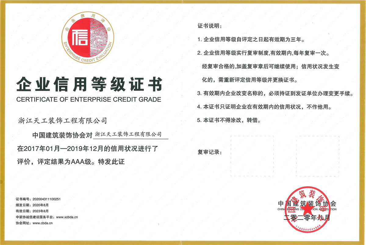 浙江天工裝飾工程有限公司成立于1994年,是一家專注于建筑行業(yè)近三十年,余杭區(qū)內(nèi)規(guī)模最大、最專業(yè)的現(xiàn)代化專業(yè)承包企業(yè),連續(xù)十二年榮獲“余杭區(qū)建筑業(yè)十強企業(yè)”稱號。公司現(xiàn)任余杭區(qū)建筑裝飾行業(yè)協(xié)會會長單位、杭州市建筑裝飾行業(yè)協(xié)會副會長單位、浙江省建筑裝飾行業(yè)協(xié)會副會長單位、中國建筑裝飾協(xié)會理事單位。公司具備建筑裝修裝飾工程專業(yè)承包壹級、建筑幕墻工程專業(yè)承包壹級、建筑裝飾工程設(shè)計專項甲級、建筑幕墻工程設(shè)計專項甲級、展覽陳列工程設(shè)計施工一體化貳級、電子與智能化工程專業(yè)承包貳級、消防設(shè)施工程專業(yè)承包貳級、防水防腐保溫工程專業(yè)承包貳級,集建筑工程施工總承包、建筑機(jī)電安裝、城市及道路照明、鋼結(jié)構(gòu)、結(jié)構(gòu)補強、安防施工等多項資質(zhì)。主要從事大型公共建筑、星級酒店的室內(nèi)精裝修、建筑幕墻及建筑智能化工程的設(shè)計與施工。 天工裝飾始終把建筑裝飾當(dāng)作一項 “美的事業(yè)”,在施工中嚴(yán)把質(zhì)量關(guān),不斷規(guī)范和提升工程技術(shù)標(biāo)準(zhǔn)。近年來,公司承建的浙商開元名都國際酒店I標(biāo)段裝飾工程、杭州藝尚雷迪森廣場酒店裝修工程、余杭區(qū)時代廣場5號樓(市民之家)室內(nèi)裝飾工程、永安之星室內(nèi)裝飾工程、青山湖科技城創(chuàng)業(yè)廣場裝修工程、杭州未來科技城醫(yī)院室內(nèi)裝飾工程、杭州師范大學(xué)附屬實驗學(xué)校裝修工程、杭州老板電器股份有限公司辦公樓裝飾工程、深川控股集團(tuán)綜合樓幕墻工程、浙江省科技信息研究院幕墻工程、北航杭州創(chuàng)新研究院(余杭)內(nèi)裝及智能化提升改造項目(研究生院)工程、臨平新城人才服務(wù)中心設(shè)計釆購施工(EPC)工程總承包項目、浙江大學(xué)先進(jìn)電氣裝備創(chuàng)新中心室內(nèi)外裝飾及改造項目設(shè)計采購施工(EPC)工程總承包項目等,先后獲得“中國建筑工程裝飾獎”、“全國建筑裝飾科技創(chuàng)新獎”、浙江省建設(shè)工程“錢江杯”優(yōu)質(zhì)工程獎、杭州市建設(shè)工程“西湖杯”優(yōu)質(zhì)工程獎、嘉興市建設(shè)工程“南湖杯”優(yōu)質(zhì)工程獎、“浙江省優(yōu)秀建筑裝飾工程獎”、“浙江省優(yōu)質(zhì)安裝質(zhì)量獎”等榮譽。 天工裝飾恪守“誠實守信、文明經(jīng)營”,近年來公司得到了客戶的信賴也獲得了業(yè)界的好評,先后被評為“國家級守合同重信用單位”、“全國建筑裝飾行業(yè)AAA級信用企業(yè)”、“全國百家科技創(chuàng)新型企業(yè)”、“浙江省AAA級守合同重信用單位”、“人民銀行信用等級AAA級企業(yè)”、“浙江省信用管理示范企業(yè)”、“浙江省誠信企業(yè)”、“浙江省建筑裝飾行業(yè)強優(yōu)企業(yè)”、“杭州市建筑業(yè)優(yōu)秀企業(yè)”、“余杭區(qū)建筑業(yè)十強企業(yè)”、 “余杭區(qū)人民政府質(zhì)量獎”等榮譽。